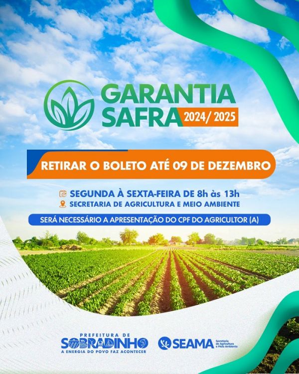 A Prefeitura de Sobradinho, por meio da Secretaria de Agricultura e Meio Ambiente (SEAMA), informa aos agricultores cadastrados no programa Garantia-Safra 2024/2025, que o prazo para a retirada do boleto se encerra no próximo dia 9 de dezembro.