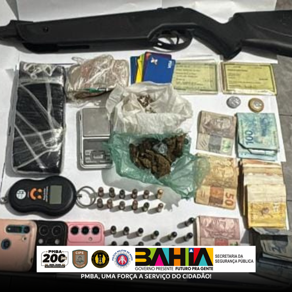 Policiais Militares Especializados durante rondas ostensivas no município de Remanso encontraram 496,3g de erva análogo à maconha, 286,1g de substância análogo à crack, 01(uma) porção de erva análogo à maconha invólucro em um saco plástico, 01(uma) porção de semente de maconha, 25 (vinte e cinco) munições de cal .38, 01(uma) espingarda de pressão, 01(uma) balança de precisão, 01(uma) balança portátil, 08(oito) cartões de banco, 01(um) smartphone Motorola azul, 01(um) smartphone Redmi e 01(um) smartphone Samsung.