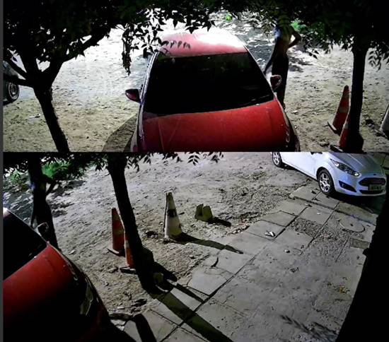 Imagens de câmeras de segurança mostram um dos suspeitos tentando abrir os veículos. Em outro registro, um dos homens aparece carregando uma escada, o que levanta suspeitas de que o grupo pretendia subir por locais menos acessíveis.