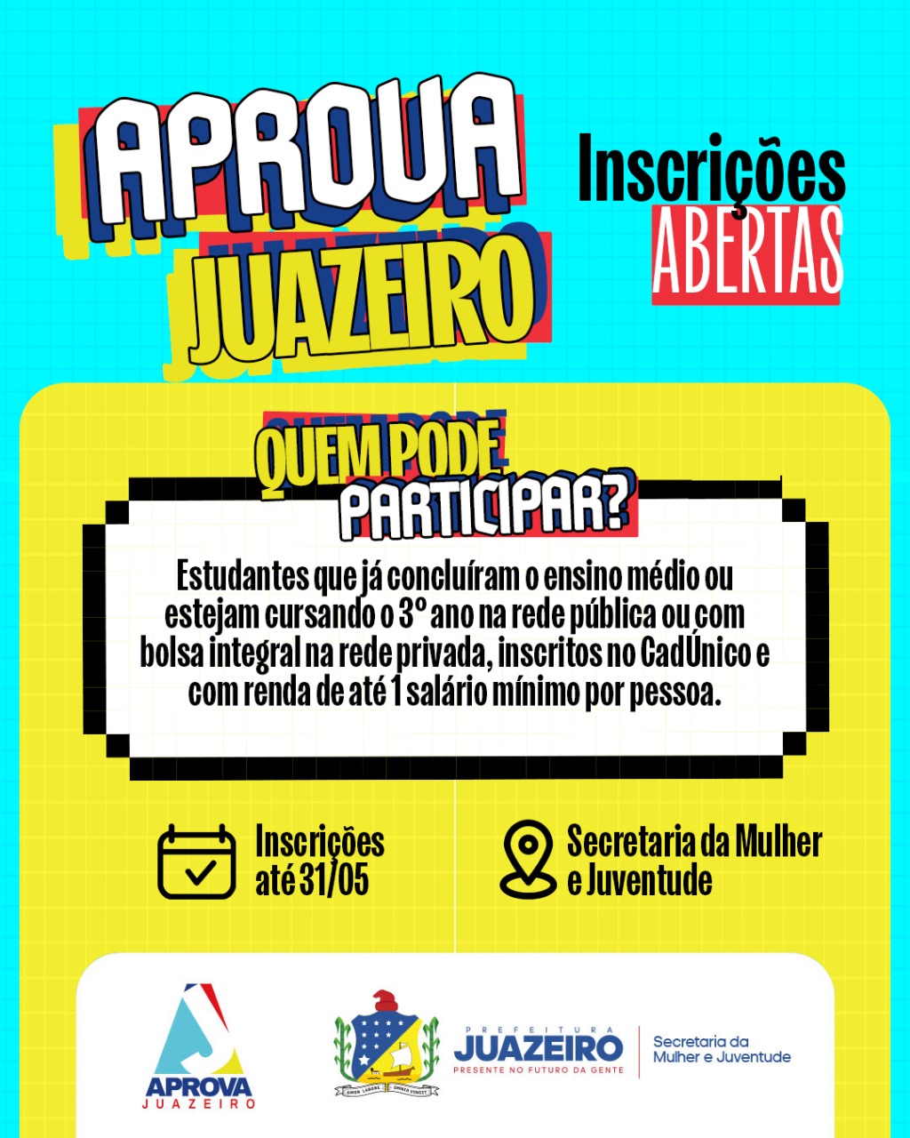 A Prefeitura de Juazeiro, por meio da Secretaria da Mulher e Juventude (SMJ), segue com inscrições abertas para o processo seletivo do Programa Aprova Juazeiro, que oferece bolsas integrais em cursos Pré-Vestibular e Pré-Enem para estudantes da rede pública. A grande novidade desta edição é a inclusão de cotas, reforçando o compromisso com a equidade no acesso ao ensino superior.