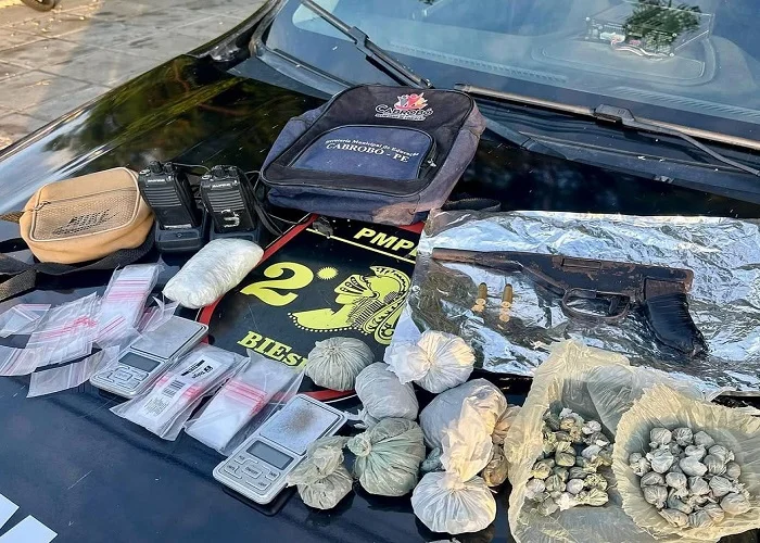 Foram apreendidas além da arma, duas munições do mesmo calibre, 262g de cocaína, 208g de maconha, embalagens e rádios de comunicação.