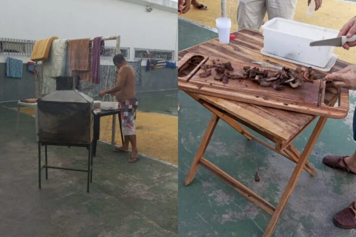 A carne do boi teria sido usada para fazer churrascos na quadra do presídio. Em uma das fotos, um dos detentos aparece com o rosto virado, preparando as carnes, que, em outra imagem, aparecem fatiadas.