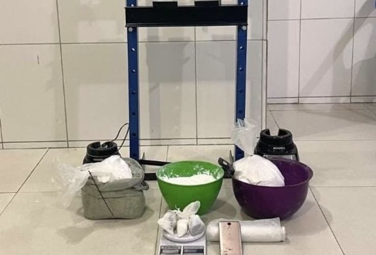 No local, os policiais encontraram mais de 6,7 quilos de cocaína, além de pequenas quantidades de maconha e crack. Também foram apreendidos uma prensa hidráulica, uma balança de precisão e diversos materiais utilizados na preparação e embalagem da droga, como liquidificadores, sacos plásticos e bacias.