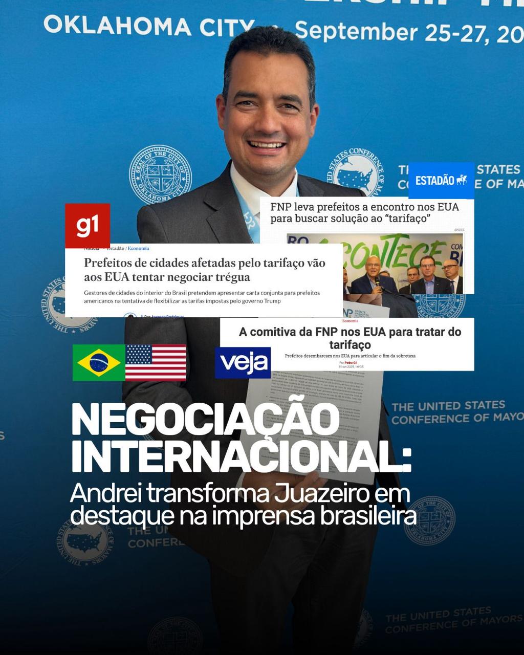 O nome de Juazeiro voltou a ser destaque em veículos de alcance nacional como UOL, Estadão, Veja e Globo (G1). O motivo foi a participação do prefeito Andrei Gonçalves na Conferência Nacional de Prefeitos dos Estados Unidos, realizada em Oklahoma. Ele foi o único prefeito do país a defender diretamente o agronegócio brasileiro no encontro, colocando a cidade no centro de um debate que envolve comércio internacional e o futuro da produção de frutas do Vale do São Francisco e do Brasil.