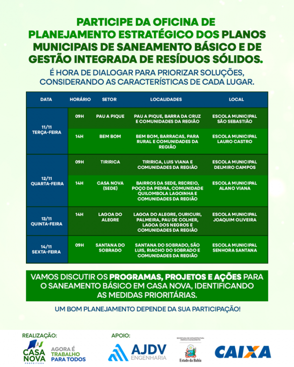 Entre os dias 11 e 14 de novembro, a Prefeitura de Casa Nova realizará oficinas de Planejamento Estratégico dos Planos Municipais de Saneamento Básico e de Gestão Integrada de Resíduos Sólidos.