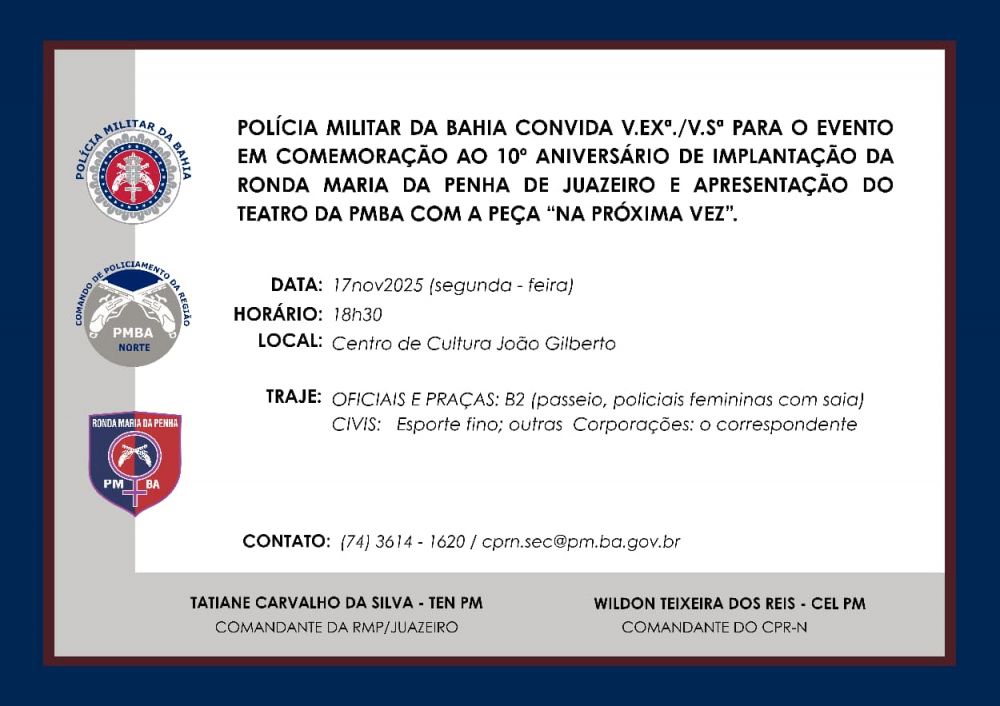 A Polícia Militar da Bahia, realizará na noite desta segunda-feira (17), às 18h30, no Centro de Cultura João Gilberto, em Juazeiro (BA), um evento em comemoração ao 10º aniversário de implantação da Ronda Maria da Penha de Juazeiro e apresentação do teatro da PMBA com a peça “Na próxima vez” …