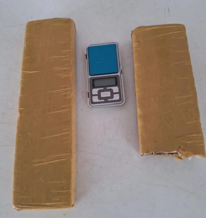 Durante a operação, foram apreendidos dois tabletes de maconha, totalizando aproximadamente 1,3 kg, além de uma balança de precisão.