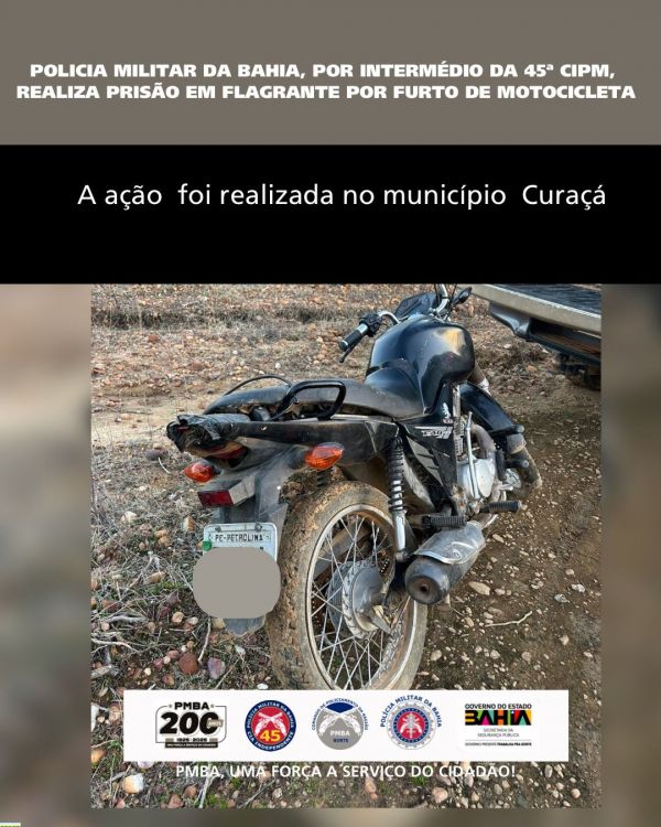A Polícia Militar da Bahia, por intermédio da 45ª CIPM, realizou a prisão em flagrante de um homem acusado de furtar uma motocicleta no dia 21 de novembro.