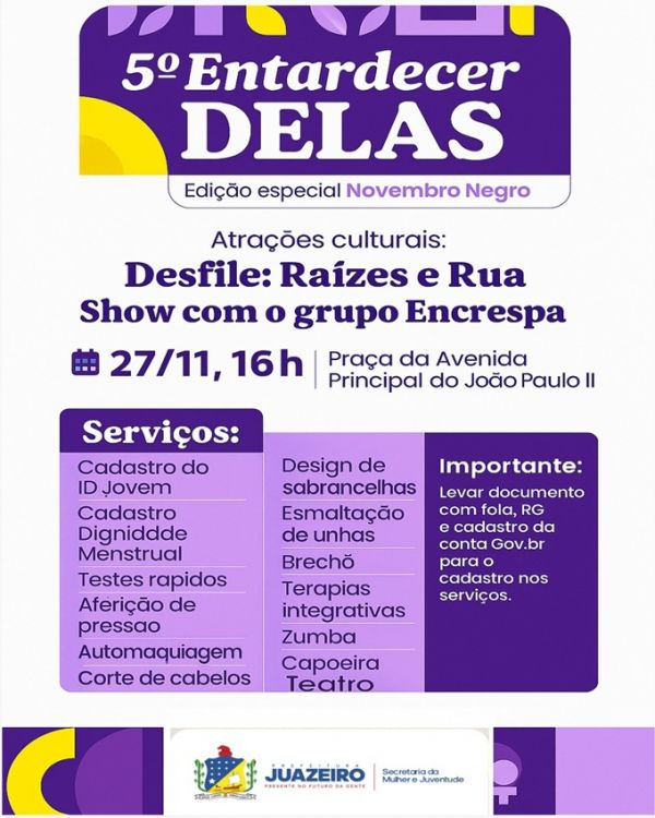 A Prefeitura de Juazeiro, por meio da Secretaria da Mulher e Juventude (SMJ), promove nesta quinta-feira (27) o 5º Entardecer Delas – Edição Especial Novembro Negro, um evento voltado para a valorização, autonomia e bem-estar das mulheres do município. A ação acontecerá a partir das 16h, na Praça da Avenida Principal do João Paulo II, com uma programação repleta de atividades culturais e serviços gratuitos.