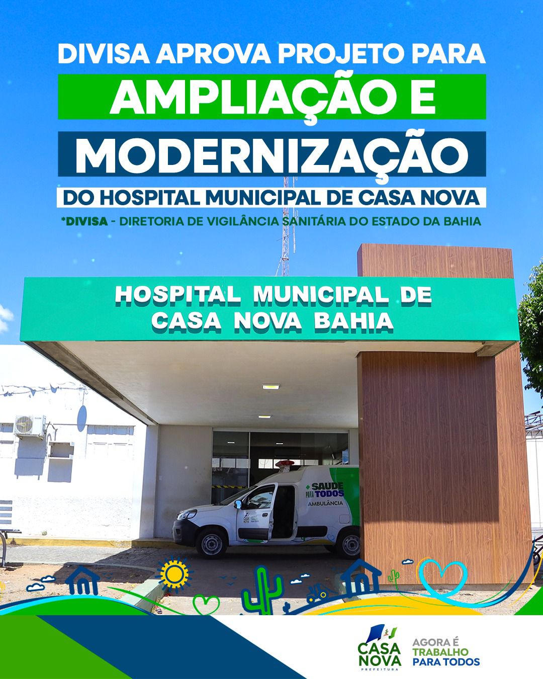 A Gestão Anisio Viana acaba de conquistar mais um grande avanço para a saúde de Casa Nova. A DIVISA – Diretoria de Vigilância Sanitária do Estado da Bahia, aprovou o projeto completo de ampliação, reforma e modernização do Hospital Municipal, autorizando oficialmente o município a seguir para a fase de execução da obra.