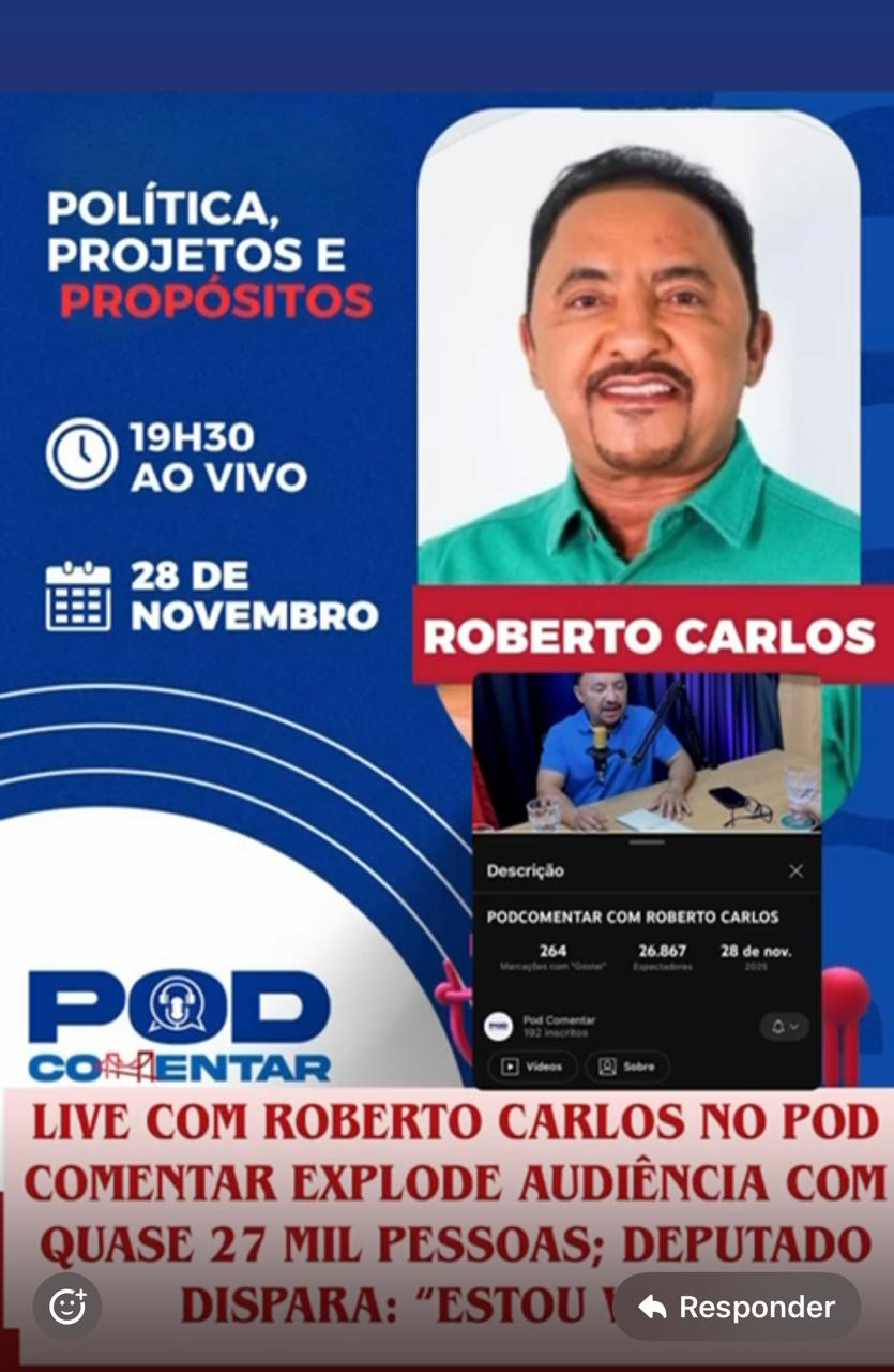 A participação do deputado estadual Roberto Carlos no Pod Comentar, nesta sexta-feira (28), se tornou um dos episódios mais assistidos da história do programa. A transmissão ao vivo registrou quase 27 mil espectadores simultâneos, consolidando o forte interesse do público na entrevista.