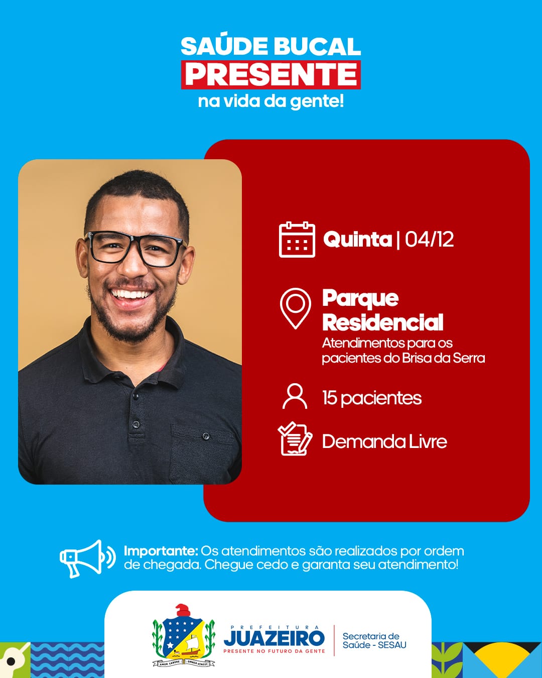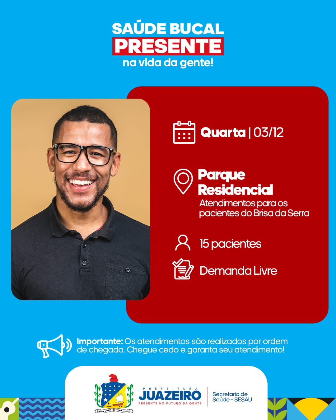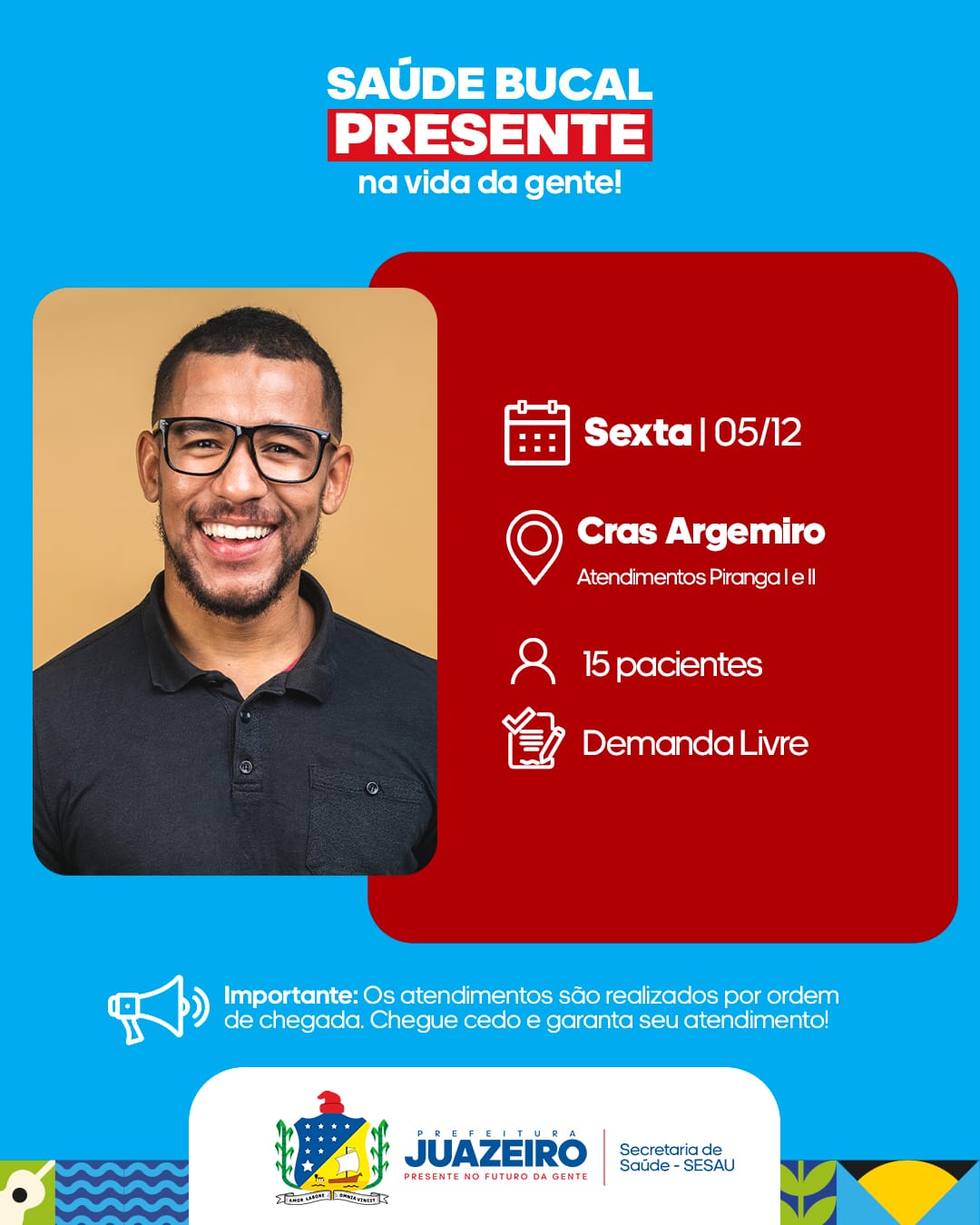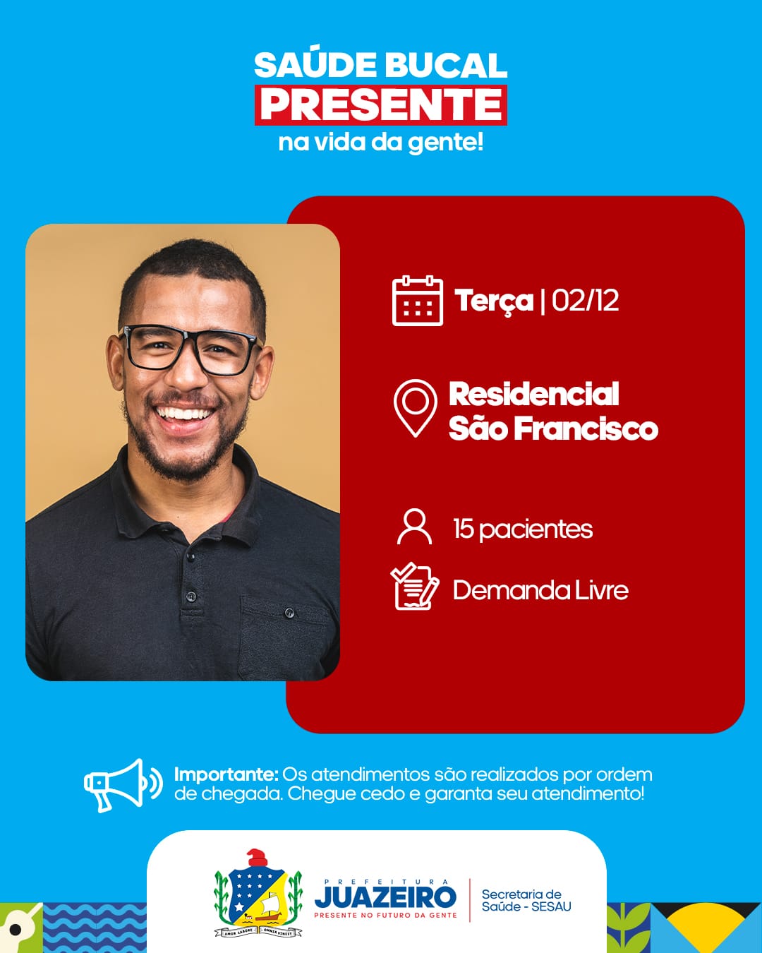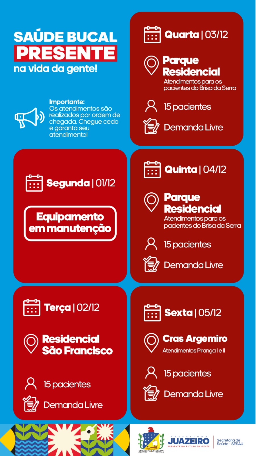 A Unidade de Atendimento Odontológico Móvel (UOM) segue levando serviços para a população. A iniciativa realizada pela Prefeitura de Juazeiro, por meio da Secretaria Municipal de Saúde (Sesau), está oferecendo, entre os dias 2 e 5 de dezembro, 15 atendimentos diários a partir das 8h. É necessário que os pacientes apresentem RG, CPF e Cartão SUS.