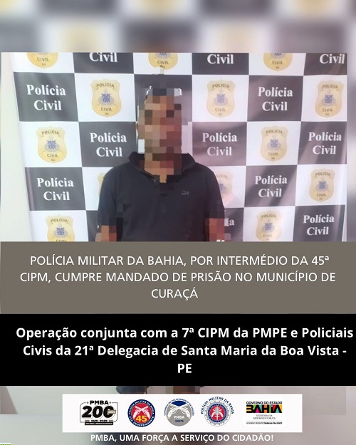 Nesta quarta-feira (04), durante operação conjunta com a 7ª CIPM da PMPE e policiais civis da 21ª Delegacia de Santa Maria da Boa Vista – PE, a Polícia Militar da Bahia, através da 45ª CIPM, deu cumprimento a um mandado de prisão em desfavor de um homem no município de Curaçá – BA.