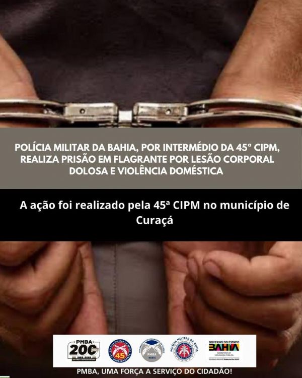 A Polícia Militar da Bahia, por meio da 45ª Companhia Independente de Polícia Militar (CIPM), realizou a prisão em flagrante por lesão corporal dolosa e violência doméstica, com base na Lei Maria da Penha, no município de Curaçá.