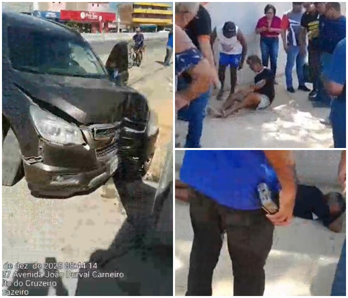 Ainda não temos detalhes sobre o acidente, mas imagens mostram duas pessoas caídas, provavelmente arremessadas após o choque com o veículo, que ficou bastante danificado ao bater num poste. Rede GN/Imagens redes sociais