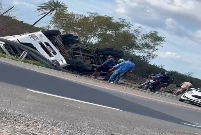 Uma carreta tombou na BR-407, próximo ao Burrinho, Zona Rural de Petrolina (PE) nesta terça-feira (09).