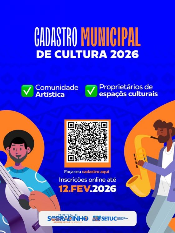 A Prefeitura de Sobradinho, através da Secretaria de Turismo, Cultura e Esporte (SETUC), convoca a comunidade artística e os donos de espaços culturais locais para realização do Cadastro Municipal de Cultura do ano 2026. As inscrições serão realizadas na modalidade online, entre os dias 10 de dezembro de 2025 e 12 de fevereiro de 2026.