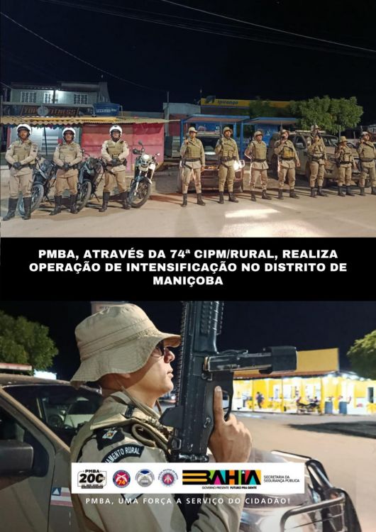 A Polícia Militar da Bahia, através da 74ª CIPM/Rural, realizou na data de 26 de dezembro de 2025 a Operação Intensificação no distrito de Maniçoba, com o objetivo de reforçar o policiamento ostensivo, ampliar a sensação de segurança da população e prevenir a ocorrência de Crimes Violentos Letais Intencionais (CVLI), com a atuação integrada da guarnição CVLI, PETO Rural e Grupamento Carcará, intensificando a presença policial e as ações preventivas na localidade.Ascom 74ª CIPM/Rural