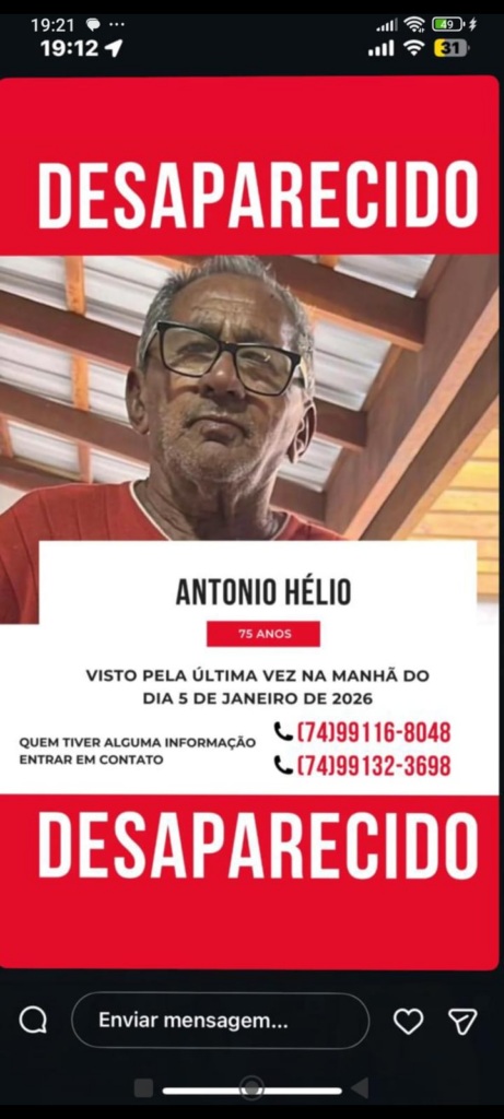 A família pede o apoio da população e solicita que qualquer informação que possa ajudar a localizar Antônio Hélio seja repassada imediatamente aos familiares através do número (74) 99132-3698 ou (74) 99148-0772.
