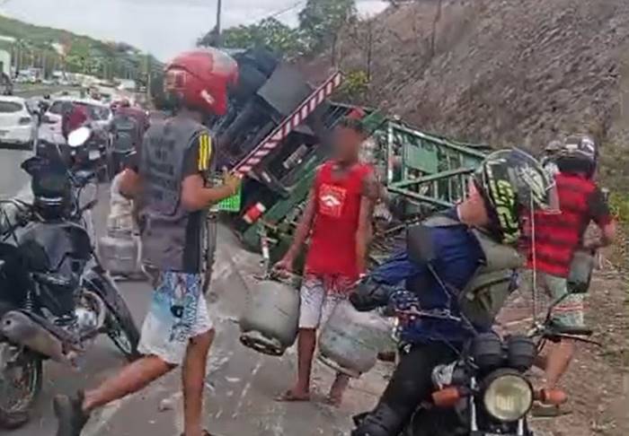 Um caminhão que transportava botijões de gás de cozinha tombou na BR-101, no bairro do Ibura, Zona Sul do Recife (PE), na manhã desta segunda-feira (12). A população saqueou parte da carga.