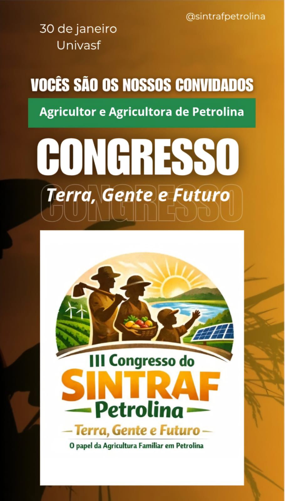 O Sindicato da Agricultura Familiar de Petrolina (Sintraf-Petrolina) realiza, no dia 30 de janeiro, o III Congresso do Sintraf Petrolina, na Universidade Federal do Vale do São Francisco (Univasf), em Petrolina.