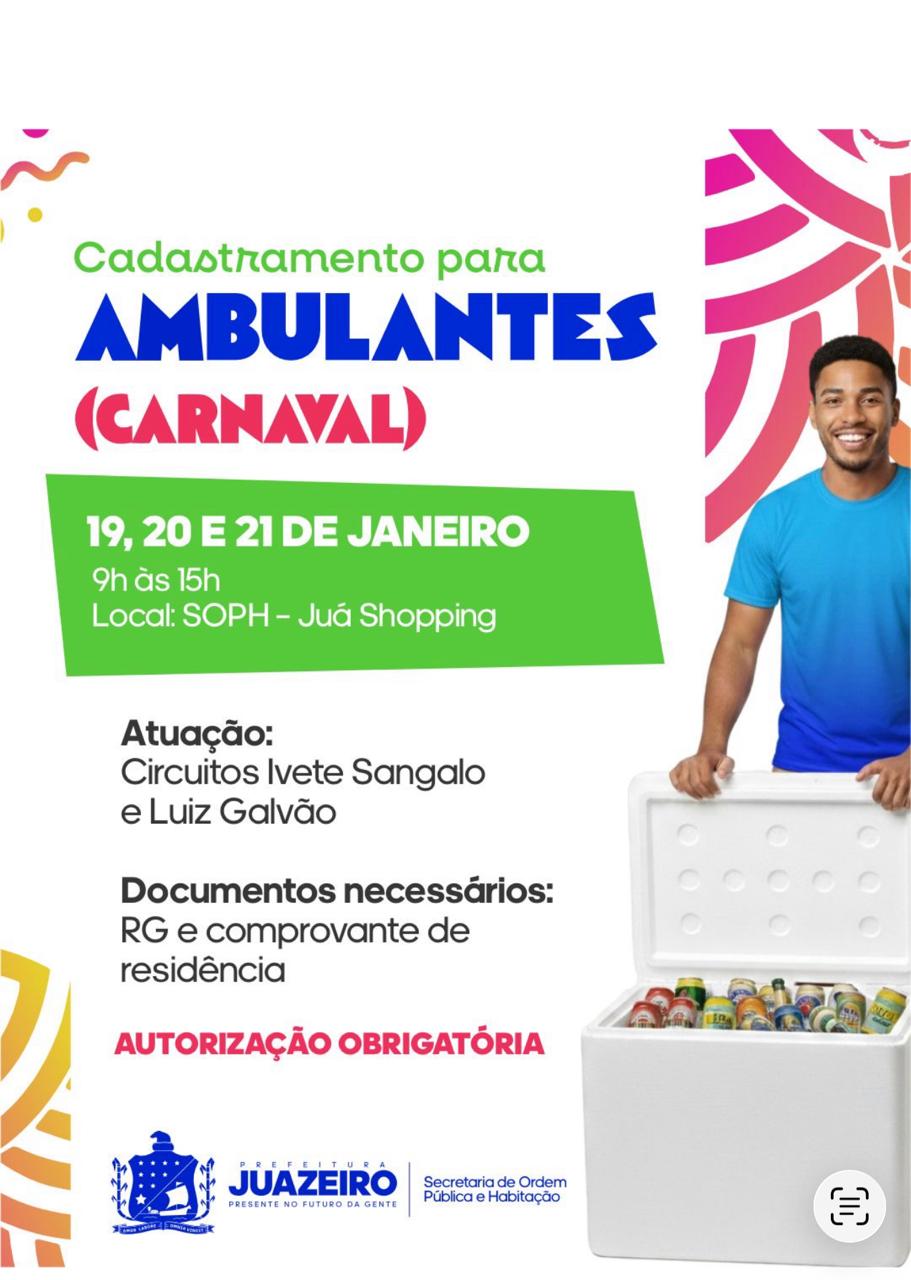 A Prefeitura de Juazeiro vai abrir o credenciamento para o comércio durante os festejos do Carnaval de Juazeiro 2026 — “O Carnaval do Brasil começa aqui!” — que acontecerá de 29 de janeiro a 1º de fevereiro. A autorização é obrigatória e será concedida pela Secretaria de Ordem Pública e Habitação (SOPH), responsável pela organização e ordenamento das atividades comerciais no período.