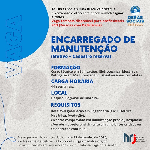 O Hospital Regional de Juazeiro (HRJ), administrado pelas Obras Sociais Irmã Dulce (OSID), abriu nesta sexta-feira (16), o processo seletivo para o cargo de encarregado de manutenção. Os interessados devem enviar o currículo anexado em formato PDF através do endereço de e-mail curriculo.hrj@irmadulce.org.br, até o dia 23 de janeiro (sexta-feira). No assunto do e-mail, deve ser informado o nome da vaga.