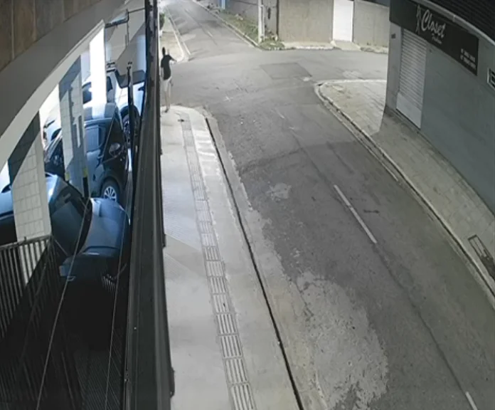 Câmeras de monitoramento flagraram um homem não identificado quebrando uma placa de sinalização no Centro de Petrolina (PE).