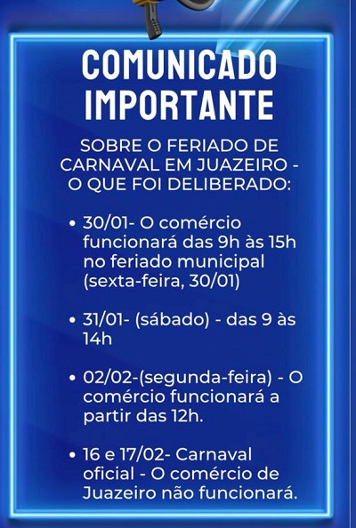 A Câmara de Dirigentes Lojistas (CDL) de Juazeiro divulgou, por meio de comunicado em seu perfil oficial no Instagram, os horários de funcionamento do comércio durante o período que envolve o feriado de Carnaval no município.