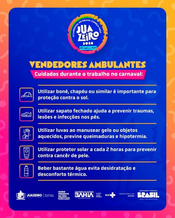 Com a proximidade do Carnaval de Juazeiro, que acontece entre os dias 29 de janeiro e 1º de fevereiro e marca a abertura dos festejos momescos do Brasil, a Secretaria Municipal de Saúde (Sesau), por meio da Vigilância em Saúde e do Centro de Referência em Saúde do Trabalhador (Cerest), reforça orientações importantes voltadas aos vendedores ambulantes que irão atuar durante o período festivo.