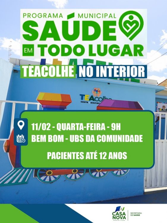 A Prefeitura de Casa Nova, por meio da Secretaria Municipal de Saúde, realiza no dia 11 de fevereiro, a partir das 9h, atendimento do TEAcolhe na comunidade de Bem Bom, interior do município. A ação acontecerá na Unidade Básica de Saúde (UBS) e será destinada a crianças de até 12 anos incompletos, com atendimento limitado a até 30 pacientes.