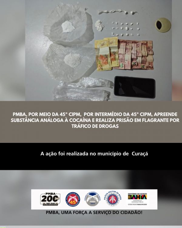 A Polícia Militar da Bahia (PMBA), por intermédio da 45ª Companhia Independente de Polícia Militar (CIPM/Curaçá), realizou, neste sábado (07), a apreensão de substância análoga à cocaína e a prisão em flagrante de um homem por tráfico de drogas, no município de Curaçá.