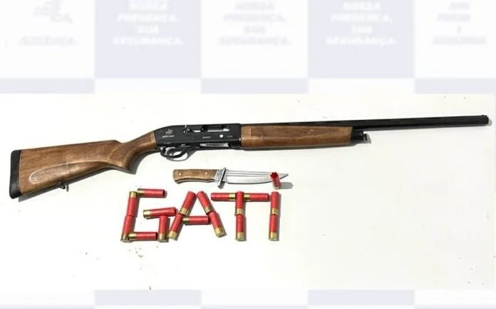 Foram feitas buscas na casa e em um terreno baldio ao lado, onde o suspeito juntamente com um espingarda calibre 12, ainda carregada, foram encaminhados à delegacia.