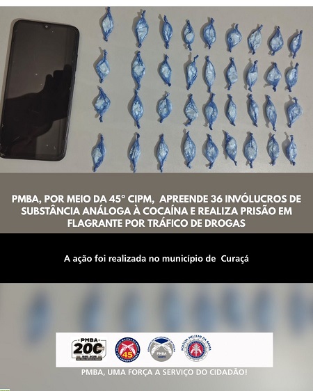 A Polícia Militar da Bahia (PMBA), por intermédio da 45ª Companhia Independente de Polícia Militar (CIPM/Curaçá), realizou, neste sábado (21), a apreensão de 36 invólucros de substância análoga à cocaína e a prisão em flagrante por tráfico de drogas no município de Curaçá.