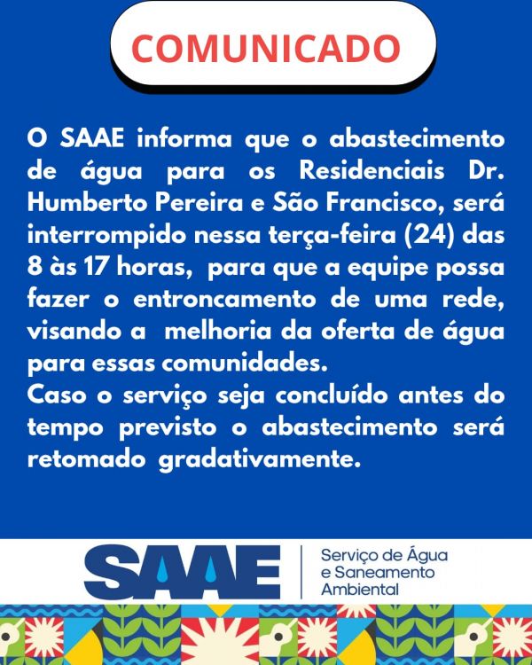 O Serviço de Água e Saneamento Ambiental de Juazeiro-SAAE informa que o abastecimento de água para os Residenciais Dr. Humberto Pereira e São Francisco será interrompido nesta terça-feira (24) das 08 às 17 horas para que a equipe possa fazer o entrocamento de uma rede visando a melhoria na oferta de água para essas comunidades.