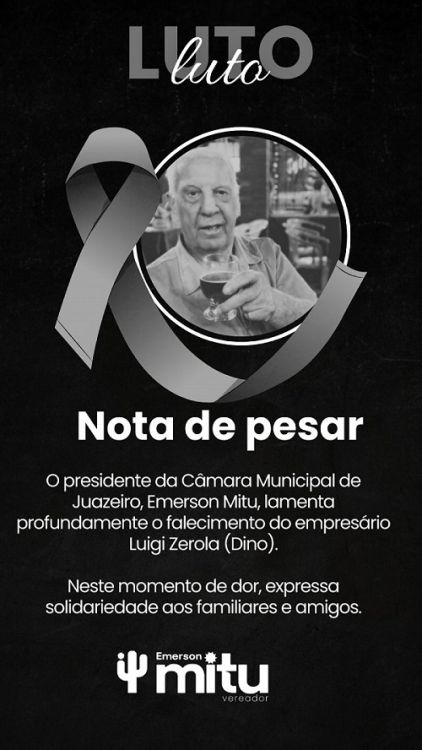 “O presidente da Câmara Municipal de Juazeiro, Emerson José da Silva, manifesta profundo pesar pelo falecimento do empresário Luigi Zerola (Dino).