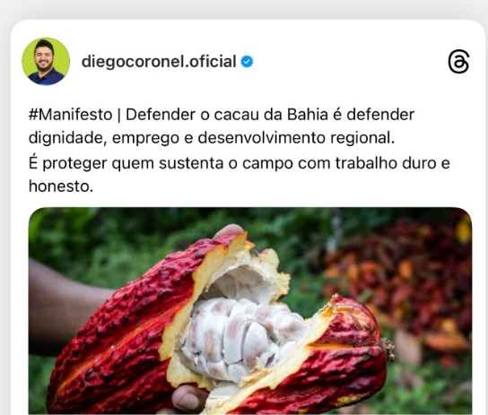O deputado federal Diego Coronel manifestou preocupação com a recente queda no preço do cacau e os impactos diretos que a situação pode causar na economia da Bahia. Segundo o parlamentar, a desvalorização do produto não representa apenas um indicador econômico, mas uma realidade que afeta diretamente a renda de milhares de famílias que dependem da atividade no campo.