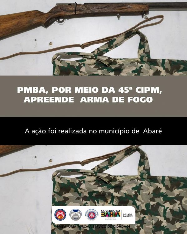 A Polícia Militar da Bahia (PMBA), por intermédio da 45ª Companhia Independente de Polícia Militar (45ª CIPM/Curaçá), realizou, neste domingo (8), a apreensão de uma arma de fogo no município de Abaré.