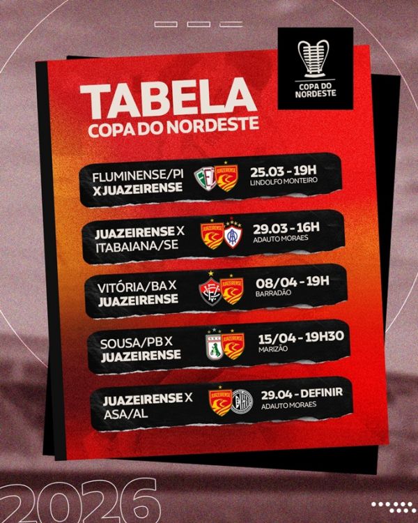 A Juazeirense já conhece sua caminhada na Copa do Nordeste e fará a estreia na competição no dia 25 de março, às 19h, contra o Fluminense-PI, no estádio Lindolfo Monteiro, em Teresina. A equipe comandada pelo treinador Carlos Rabello segue em ritmo intenso de treinamentos, ajustando o elenco para a disputa do torneio regional e também da Série D do Campeonato Brasileiro, duas competições importantes no calendário do Cancão de Fogo.