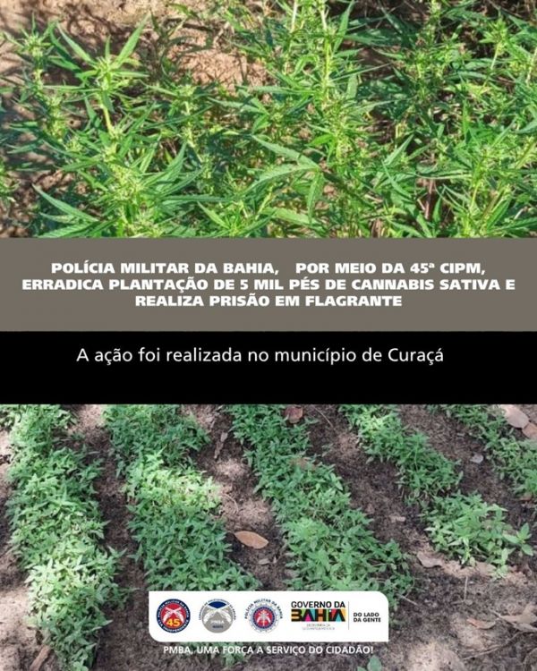 A Polícia Militar da Bahia (PMBA), por intermédio da 45ª Companhia Independente de Polícia Militar (45ª CIPM/Curaçá), realizou, nesta quarta-feira (25), a erradicação de aproximadamente 5.000 pés de Cannabis sativa e a prisão em flagrante de um indivíduo, durante patrulhamento na zona rural do município de Curaçá.