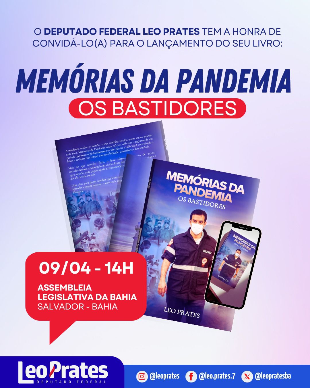 O deputado federal Leo Prates (Republicanos-BA) lança, no próximo dia 9 de abril, em Salvador, o livro “Memórias da Pandemia – Os Bastidores”. A obra revisita, com profundidade e sensibilidade, os momentos mais críticos da crise sanitária provocada pela Covid-19 e propõe uma reflexão sobre os impactos deixados pelo período.