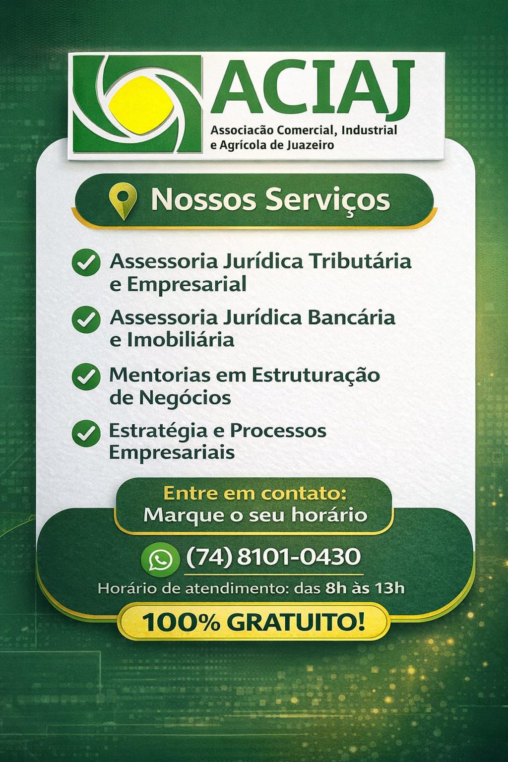 A Associação Comercial, Industrial e Agrícola de Juazeiro- Aciaj Juazeiro reforça seu compromisso com o desenvolvimento econômico da região ao disponibilizar uma série de serviços estratégicos voltados ao fortalecimento de negócios locais. A iniciativa oferece atendimentos especializados de forma totalmente gratuita, ampliando o acesso de empreendedores a suporte técnico qualificado.