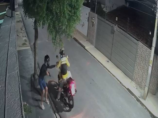 Uma câmera de vigilância de uma residência na área flagrou o exato momento em que um mototaxista tem seu veículo tomado de assalto. Na imagem, o profissional deixa o suspeito, que se passava por cliente, mas é surpreendido quando este puxa uma arma da cintura e pede que o mototaxista se afaste da moto.
