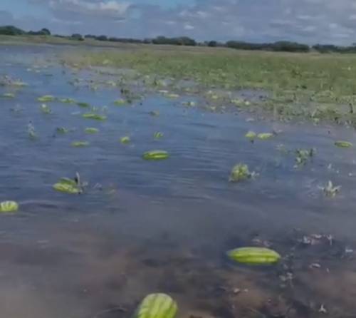 Parte das plantações de melancia nas roças às margens do rio foram completamente alagadas. O pior é que a melancia produzida já estava praticamente pronta para a colheita.