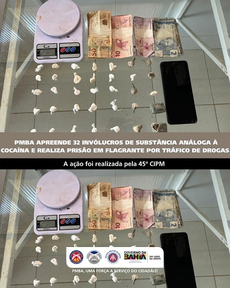 A Polícia Militar da Bahia (PMBA), por intermédio da 45ª Companhia Independente de Polícia Militar (CIPM/Curaçá), realizou, nesta segunda-feira (20), a apreensão de 32 invólucros de substância análoga à cocaína, 02 papelotes de substância análoga à maconha, além da prisão em flagrante de um indivíduo por tráfico de drogas no município de Curaçá.