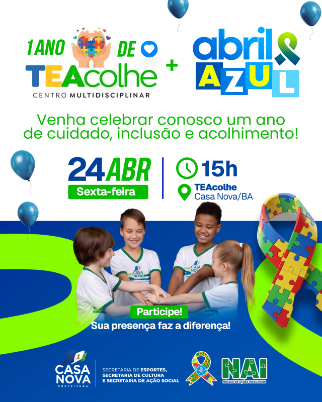A Prefeitura de Casa Nova, por meio das Secretarias de Saúde, Cultura, Esportes e Ação Social, realiza nesta sexta-feira (24), a partir das 15h, um evento especial em comemoração ao primeiro ano de funcionamento do Centro Multidisciplinar da Pessoa com Transtorno do Espectro Autista (TEAcolhe). A ação integra a programação do Abril Azul, mês dedicado à conscientização sobre o autismo, e será aberta a toda a comunidade.O evento acontecerá na sede do TEAcolhe, na Praça Gilson Viana e promete uma tarde marcada pelo acolhimento, inclusão e integração entre famílias e profissionais. A programação conta com diversas atividades interativas, apresentações culturais e estandes com serviços e orientações importantes, fortalecendo o compromisso da gestão municipal com o cuidado e o respeito às diferenças.