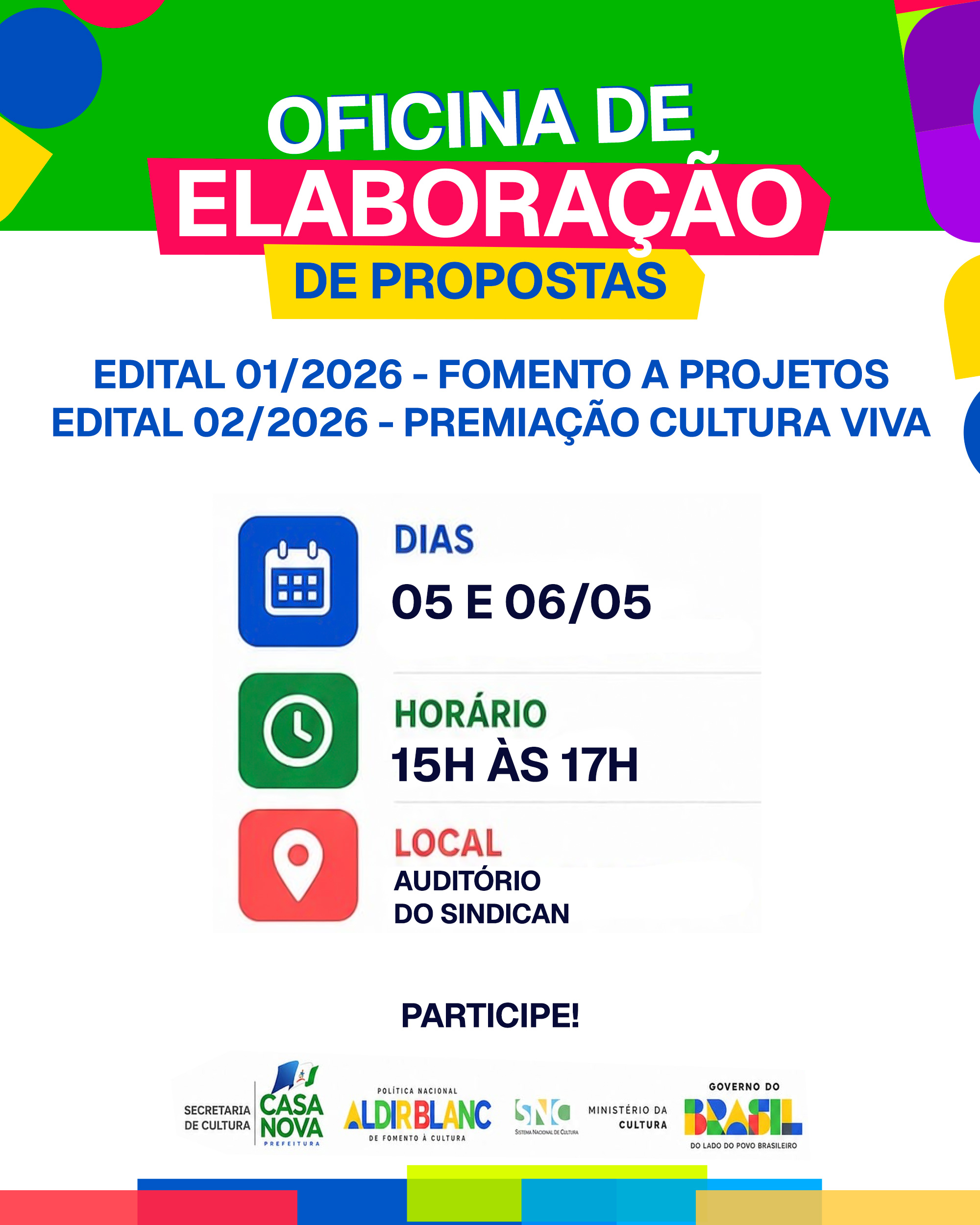 A Prefeitura de Casa Nova, por meio da Secretaria Municipal de Cultura, realiza nos dias 05 e 06 de maio a Oficina de Elaboração de Propostas – Edital 01/2026 (Fomento a Projetos) e 02/2026 (Premiação Cultura Viva), voltada ao fortalecimento da participação de artistas, produtores e agentes do setor nos processos de fomento no município.