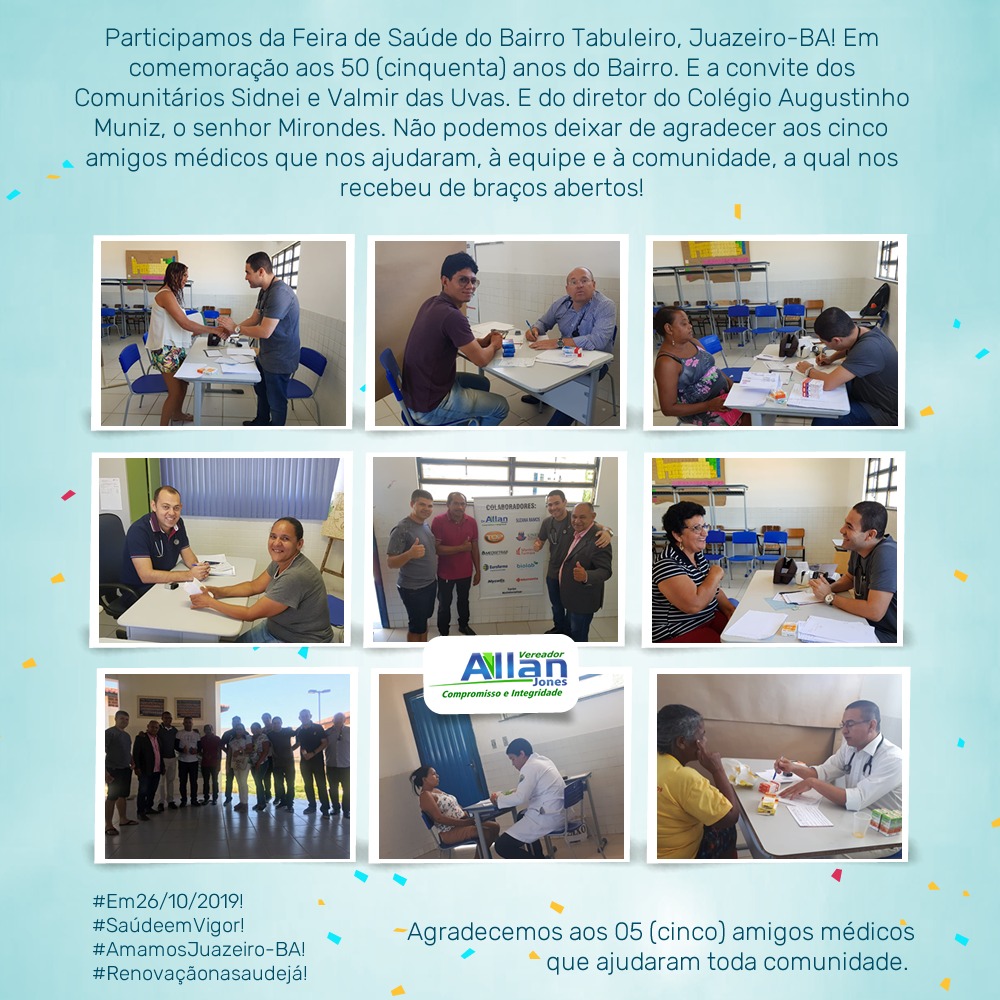 “Participamos da Feira de Saúde no Tabuleiro em comemoração aos 50 anos do bairro, a convite dos Comunitários Sidnei e Valmir das Uvas e do diretor do Colégio Augustinho Muniz, o senhor Mirondes”, disse o vereador.