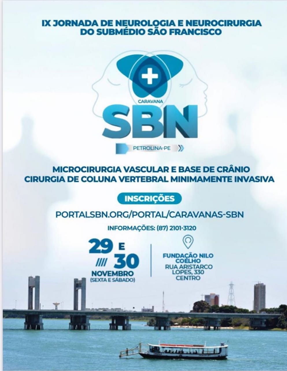 A Caravana SBN acontecerá nos dias 29 e 30 de novembro, no auditório da Fundação Nilo Coelho. Mais de 20 neurocirurgiões, de diversas partes do país, ministrarão palestras em torno dos temas: Microcirurgia vascular e base de crânio e Cirurgia de coluna vertebral minimamente invasiva.