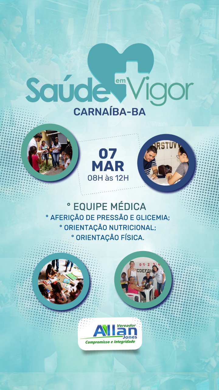 No próximo sábado, 07 de março, das 08h às 12h, o vereador Allan Jones (PTC) vai realizar mais uma edição do “Projeto Saúde em Vigor”, no Distrito de Carnaíba do Sertão, em Juazeiro. Na ocasião, estará presente uma equipe médica e serão oferecidos serviços de aferição de pressão e glicemia, orientação nutricional e física.